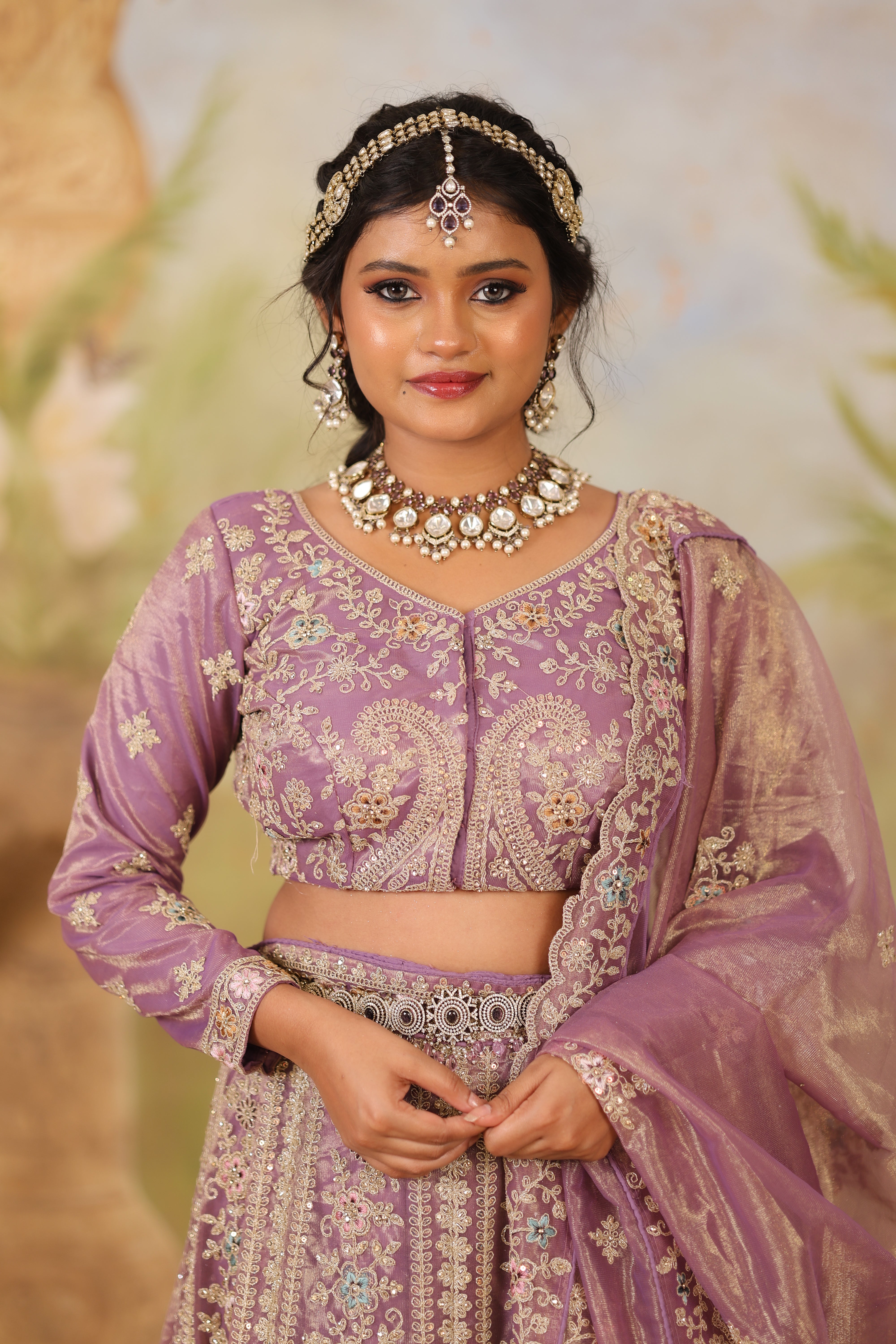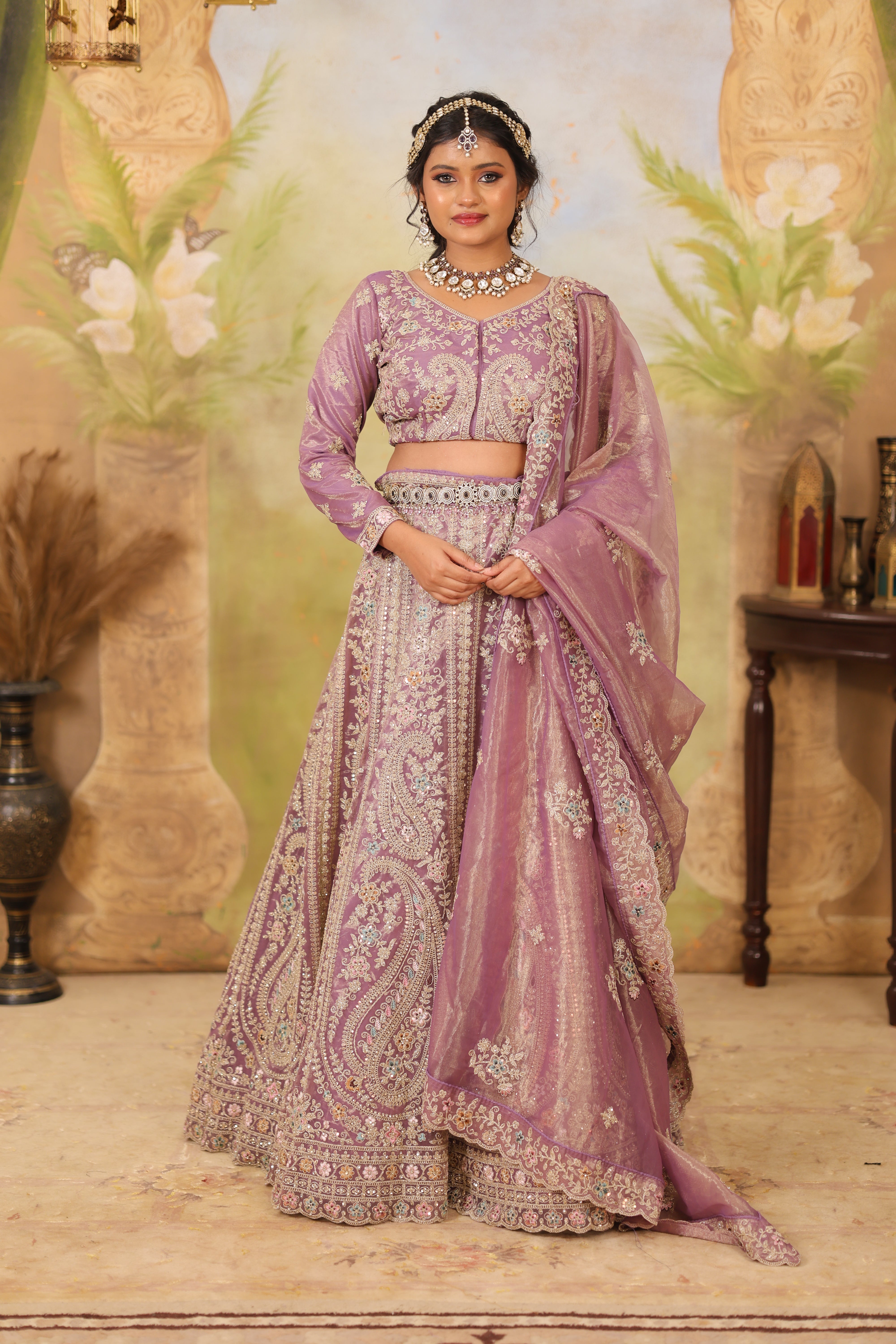 Step into timeless elegance with our fully stitched Lavender Grand Bridal Lehenga, crafted for those who love a perfect blend of luxury and grace. The lehenga features a beautifully embroidered bordered skirt, paired with a fully embellished blouse adorned with both hand and machine embroidery for a rich, detailed finish.